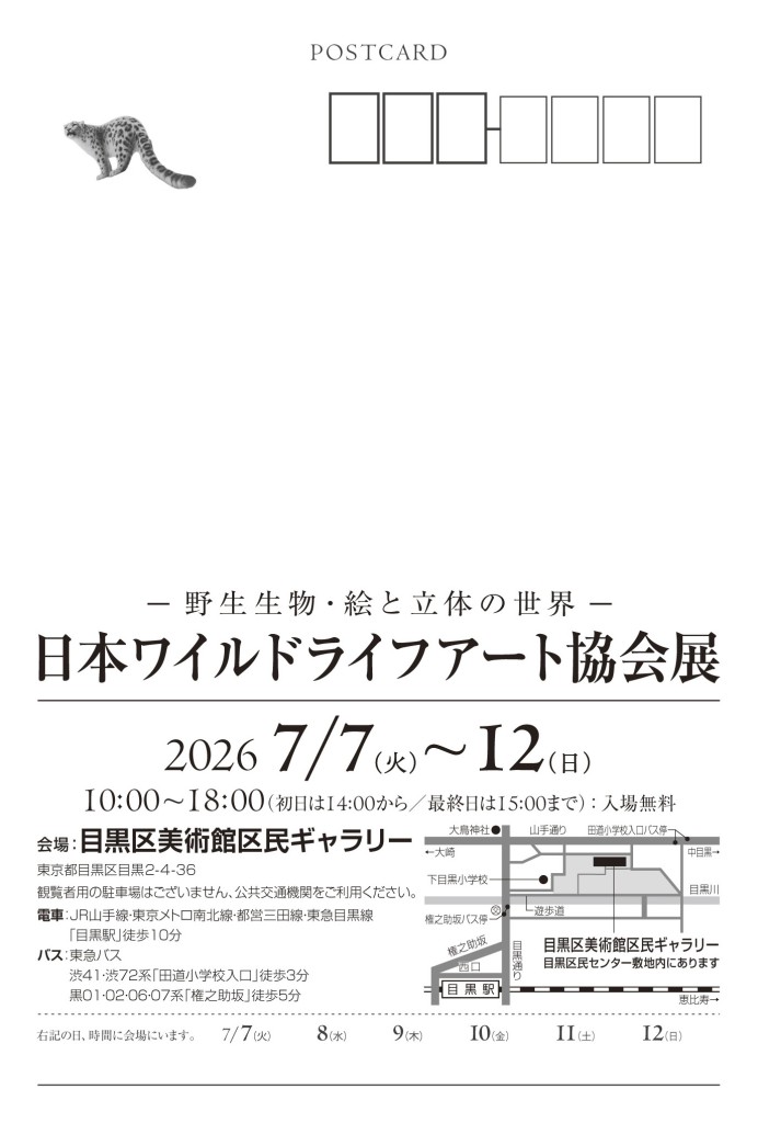 2026年7月7日(火)から7月12(日)まで、目黒区美術館区民ギャラリーにて日本ワイルドライフアート協会展を開催いたします。