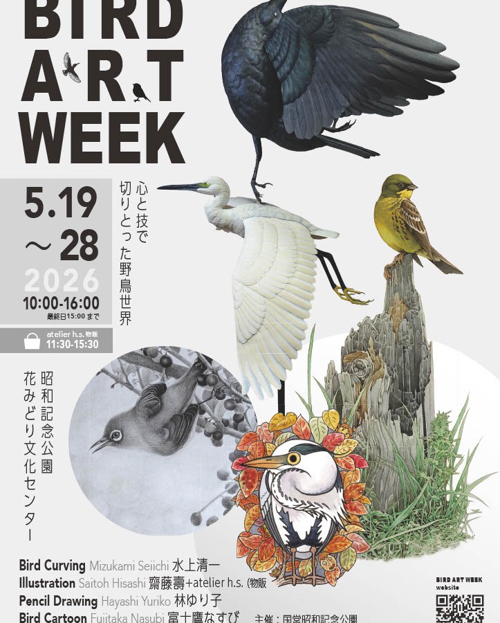 5月19日(火)から5月28日 (日)まで、昭和記念公園花みどり文化センターにて、野鳥アートイベント『BIRD ART WEEK』が開催されます。 会員の水上清一さんのバードカービング教室作品展、元JAWLAS会長 齋藤壽さんの原画展、林ゆり子さんの鉛筆画グループ展、富士鷹なすびさんの野鳥まんが原画展、...